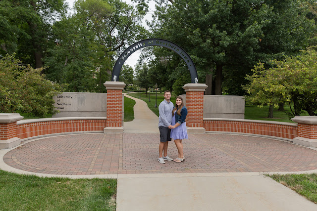 Nicole and Scott worked together at a convenience store, and they also both attended the University of Northern Iowa. When they wanted to get some engagement pictures on campus, I was thrilled. This is my alma mater, and I loved walking around campus again. I seriously could have taken pictures there all day with all the lovely backgrounds. Once we finished up at UNI, Nicole’s mom brought puppy Diggs to our next location. He was a wonderful addition to the photo session, and he behaved perfectly! Little Amelia, Nicole’s niece, also got to do a little posing. This was a nice prep session for when she acts as their flower girl at the wedding.